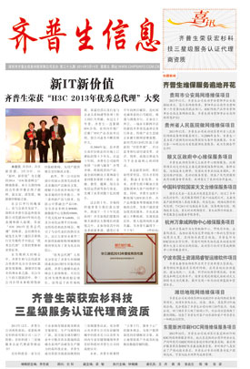 新IT 新價值 齊普生榮獲“H3C 2014年優(yōu)秀總代理”大獎
